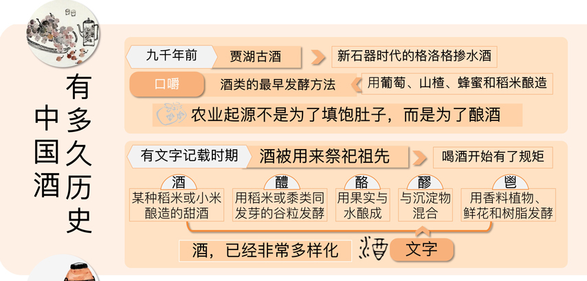 引自醉在中国说到中国酒,我们往往想起的都是白酒,但白酒在中国历史上其实是比较晚才出现的,历史上中国还出现过非常多不同的酒类。而且,从考古上来说,中国酒的历史甚至比中国文明的历史还要长。这就要从九千年前